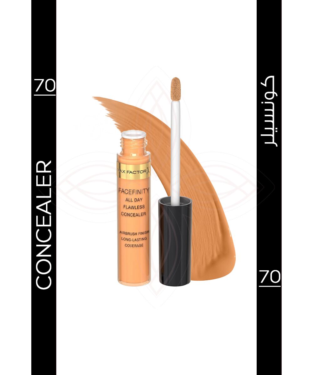 يحتوي كونسيلر فيس فينيتي يدوم طوال اليوم 70 من ماكس فاكتور على التقنية المرنة المقاومة للتعرق والماء . المصممة لتوفير تغطية خالية من العيوب ، لكنها تشعركِ بخفة الريش . يعطي تغطية متوسطة إلى كاملة ويمكن أن تضيفيها كطبقات فوق بعضها حيث تساعدك فورياً على تفتيح بشرتك وتظل منتعشة طوال اليوم . إنه مقاوم للمس وخالي من الزيوت. توفر تركيبة التقنية المرنة المقاومة للتعرق والماء المتقدمة بتغطية البشرة لتجعلها خالية من العيوب . تدوم طويلاً بحيث تتحركين مع بشرة خفيفة طوال اليوم. عند استخدامه تحت العين، يخفي الهالات السوداء ويقلل من ظهور الخطوط الدقيقة والتجاعيد لإطلالة أكثر حزماً وإشراقاً. عند استخدامه على البشرة، يخفي العيوب ويخفي المسام ويغطي بفعالية تلون البشرة وفرط التصبغ للحصول على تغطية مثالية فورية تدوم طوال اليوم. إنه سهل حيث انه ينساب ويندمج تماماً مع الجلد لتطبيق سريع.